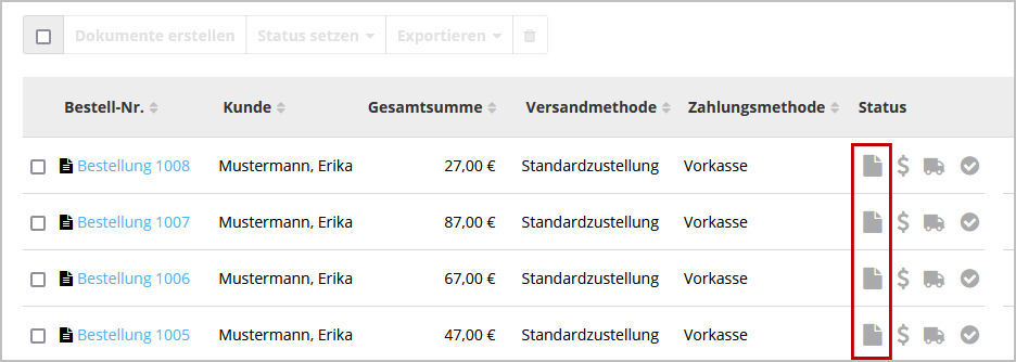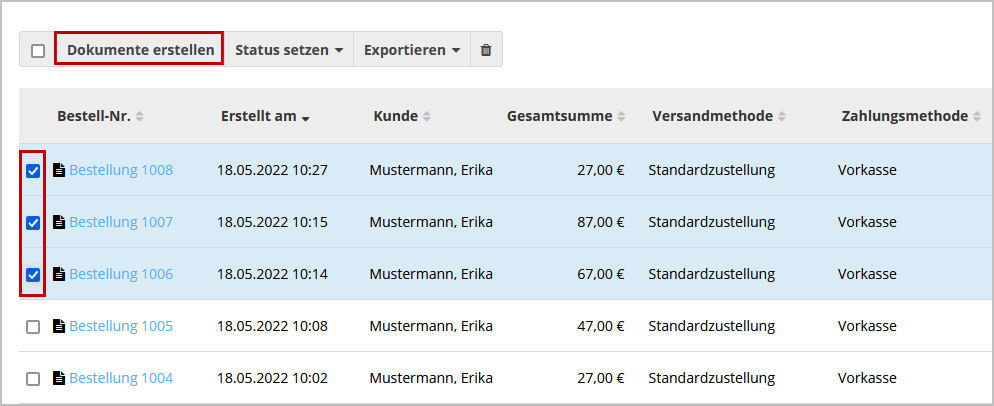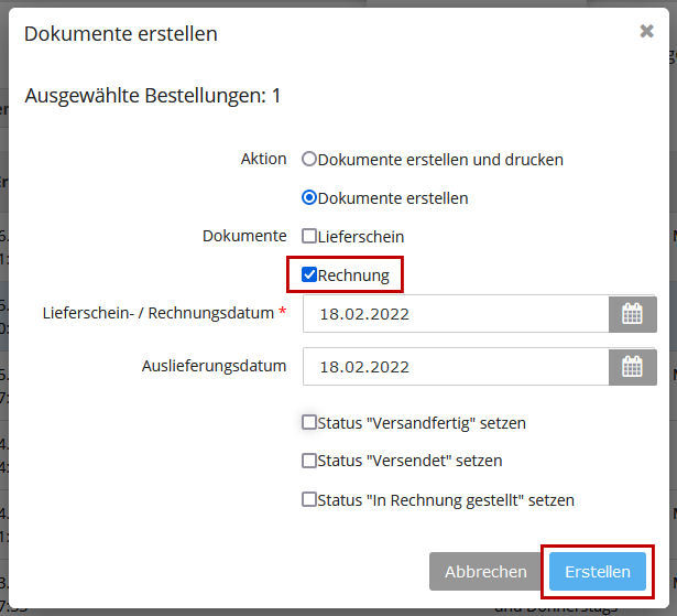 - Selektiere die gewünschten Bestellungen an, für die Du eine Rechnung erstellen willst.