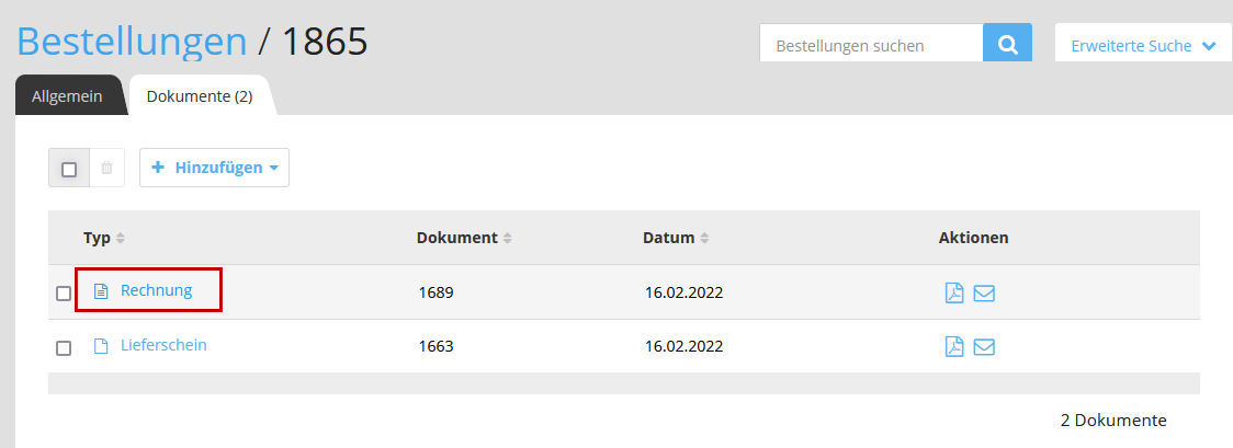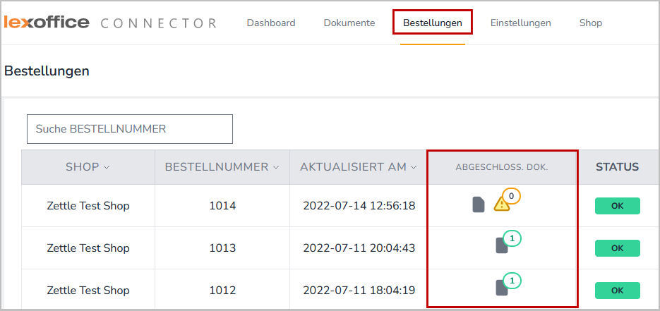 Auf „Bestellungen“ siehst Du, ob und wie viele abgeschlossene Dokumente es zu einer Bestellung auf epages gibt: