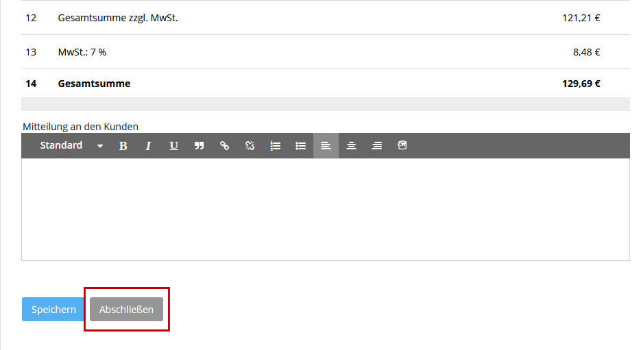 - Am Seitenende klicke auf „Abschließen“. Damit ist die Rechnung erstellt und kann nur noch durch eine Gutschrift annulliert werden.